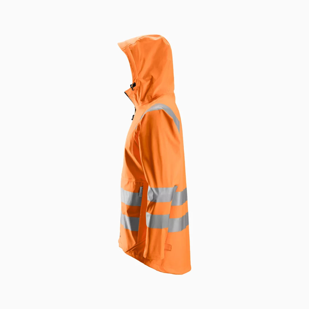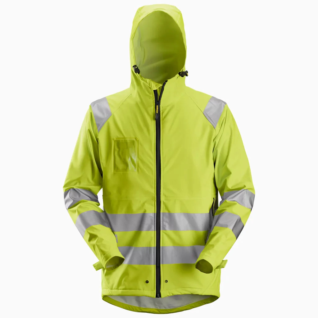 Veste imperméable à haute visibilité. Fabriquée en tissu PU extensible avec des coutures thermosoudées pour que votre journée de travail ne soit plus jamais compromise par la pluie. Conforme à la norme EN 343 et EN ISO 20471, Classe 3.